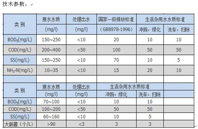污水經(jīng)格柵除去飄浮和大顆粒懸浮雜質(zhì)后進(jìn)入調(diào)節(jié)池,(調(diào)節(jié)池不在一體化中),調(diào)節(jié)池中污水由提升泵提升進(jìn)入MBR處理設(shè)備中。對(duì)于生活污水、餐用污水,污染物濃度較高,可生化性較好,適宜采用好氧生物法進(jìn)行處理。好氧工藝是一個(gè)主要耗能單元,在選擇時(shí)應(yīng)考慮如何提高污泥負(fù)荷,降低投資費(fèi)用和運(yùn)行費(fèi)用。根據(jù)上述原則,結(jié)合設(shè)備特點(diǎn),參照國(guó)內(nèi)外污水處理研究成果及已建成的廢水處理站的運(yùn)行經(jīng)驗(yàn),本方案選擇膜生物反應(yīng)器作為主處理單元,膜生物反應(yīng)器是二十世紀(jì)末發(fā)展起來(lái)的水處理高新技術(shù),它將膜分離技術(shù)與生物處理有機(jī)結(jié)合起來(lái),主要應(yīng)用于污水處理領(lǐng)域。由于它既利用了膜分離的選擇透過(guò)性,又利用了生物處理有效性,出水水質(zhì)可滿足要求。在我國(guó)作為“八五”重點(diǎn)科技攻關(guān)項(xiàng)目的膜生物反應(yīng)器污水凈化裝置已進(jìn)入產(chǎn)業(yè)化,多元公司在國(guó)內(nèi)將該技術(shù)應(yīng)用于污水處理系統(tǒng)中,并取得十分顯著的社會(huì)、環(huán)境和經(jīng)濟(jì)效益。