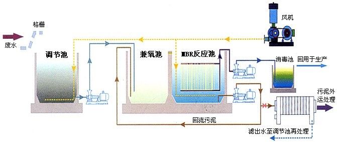 污水經(jīng)格柵除去飄浮和大顆粒懸浮雜質(zhì)后進(jìn)入調(diào)節(jié)池,(調(diào)節(jié)池不在一體化中),調(diào)節(jié)池中污水由提升泵提升進(jìn)入MBR處理設(shè)備中。對(duì)于生活污水、餐用污水,污染物濃度較高,可生化性較好,適宜采用好氧生物法進(jìn)行處理。好氧工藝是一個(gè)主要耗能單元,在選擇時(shí)應(yīng)考慮如何提高污泥負(fù)荷,降低投資費(fèi)用和運(yùn)行費(fèi)用。根據(jù)上述原則,結(jié)合設(shè)備特點(diǎn),參照國(guó)內(nèi)外污水處理研究成果及已建成的廢水處理站的運(yùn)行經(jīng)驗(yàn),本方案選擇膜生物反應(yīng)器作為主處理單元,膜生物反應(yīng)器是二十世紀(jì)末發(fā)展起來(lái)的水處理高新技術(shù),它將膜分離技術(shù)與生物處理有機(jī)結(jié)合起來(lái),主要應(yīng)用于污水處理領(lǐng)域。由于它既利用了膜分離的選擇透過(guò)性,又利用了生物處理有效性,出水水質(zhì)可滿足要求。在我國(guó)作為“八五”重點(diǎn)科技攻關(guān)項(xiàng)目的膜生物反應(yīng)器污水凈化裝置已進(jìn)入產(chǎn)業(yè)化,多元公司在國(guó)內(nèi)將該技術(shù)應(yīng)用于污水處理系統(tǒng)中,并取得十分顯著的社會(huì)、環(huán)境和經(jīng)濟(jì)效益。